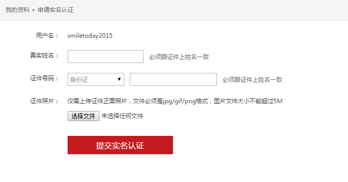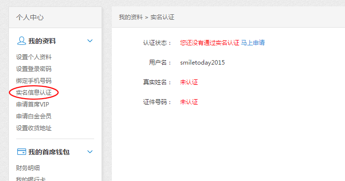 登录首席会员账号,进入“个人中心”,点击左侧导航菜单的“实名信息认证”,填写真实姓名和证件号码,上传身份证等证件照片就可以等待管理员将您提升为“认证会员”了。为了保证买卖双方的权益,我们只允许认证会员作为买卖双方进行在线交易。