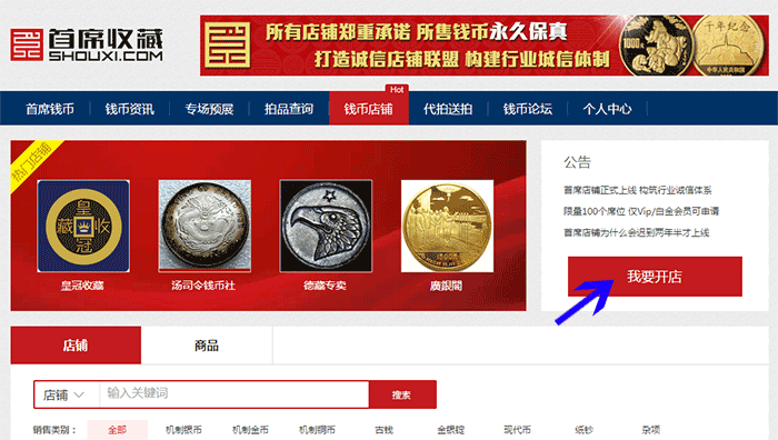 进入“钱币店铺”频道首页,点击右上角的“我要开店”,选择店铺类型是“个人店铺”还是“企业店铺”(企业店铺需要提交企业营业执照等信息),填写并提交店铺基本信息,等待管理员审批。